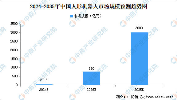 近年来,我国关于人形机器人产业的政策支持力度不断加大。2023年10月,工业和信息化部印发《人形机器人创新发展指导意见》,计划到2025年,人形机器人创新体系初步建立;到2027年,人形机器人技术创新能力显著提升,形成安全可靠的产业链供应链体系,构建具有国际竞争力的产业生态,综合实力达到世界先进水平。在政策的助推下,国内人形机器人产业将迎来快速发展期。 人形机器人市场规模正随着技术革新和应用领域的拓展而迅速增长,预计将在未来几年内迎来显著的扩张和商业化突破。中商产业研究院发布的《2024-2029年中国机器人行业深度分析及投资风险研究报告》显示,2024年中国人形机器人市场规模将达27.6亿元,市场处于起步阶段。中商产业研究院分析师预测,2029年人形机器人市场规模将达750亿元,2035年人形机器人市场规模将达3000亿元。